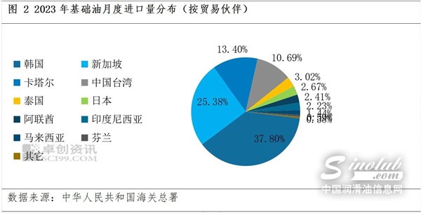 2023年進(jìn)口量排名前三的分別是韓國(guó)、新加坡、卡塔爾。其中自韓國(guó)進(jìn)口基礎(chǔ)油為66.27萬(wàn)噸,同比下降0.18%,占進(jìn)口總量的37.79%,位列第一位;自新加坡進(jìn)口基礎(chǔ)油為44.50萬(wàn)噸,同比上漲3.18%,占進(jìn)口總量的25.38%,位列第二位;自卡塔爾進(jìn)口基礎(chǔ)油為23.50萬(wàn)噸,同比上漲16.90%,占進(jìn)口總量的13.40%,排名第三位。