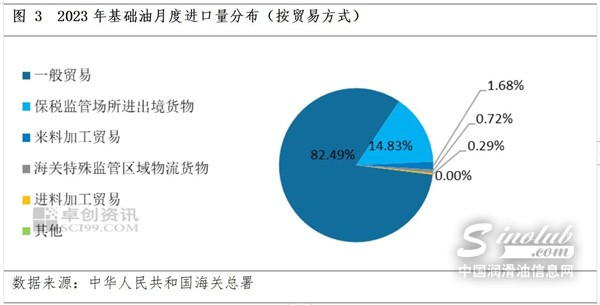 從貿(mào)易方式來(lái)看,近五年基礎(chǔ)油進(jìn)口貿(mào)易方式基本穩(wěn)定。據(jù)海關(guān)總署數(shù)據(jù)顯示,2023年基礎(chǔ)油進(jìn)口貿(mào)易方式主要為一般貿(mào)易、保稅監(jiān)管場(chǎng)所進(jìn)出境貨物及來(lái)料加工貿(mào)易。其中,一般貿(mào)易模式進(jìn)口基礎(chǔ)油占全部進(jìn)口的82.49%,排名第一位;保稅監(jiān)管場(chǎng)所進(jìn)出境貨物占進(jìn)口總量的14.83%,排名第二位;來(lái)料加工貿(mào)易占比1.67%,排名第三位。