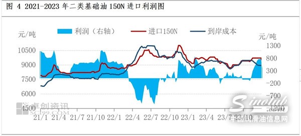 從進(jìn)口利潤(rùn)來(lái)看,2023年二類(lèi)基礎(chǔ)油進(jìn)口利潤(rùn)較去年相比有所回升,利潤(rùn)空間較為可觀。一季度受?chē)?guó)產(chǎn)資源價(jià)格上漲帶動(dòng),二類(lèi)進(jìn)口基礎(chǔ)油價(jià)格不斷攀升,且價(jià)格上行幅度遠(yuǎn)高于到岸成本上行,因此一季度二類(lèi)進(jìn)口基礎(chǔ)油理論利潤(rùn)較為可觀,進(jìn)口商進(jìn)口積極性相對(duì)較高。二季度,雖然外盤(pán)價(jià)格有所下降,但受低價(jià)國(guó)產(chǎn)資源沖擊,進(jìn)口基礎(chǔ)油國(guó)內(nèi)售價(jià)亦處于下行趨勢(shì),進(jìn)口基礎(chǔ)油利潤(rùn)空間縮減,6月份進(jìn)口基礎(chǔ)油理論利潤(rùn)出現(xiàn)虧損,二季度基礎(chǔ)油進(jìn)口積極性有所下降。三季度7-8月份外盤(pán)價(jià)格有所下降,進(jìn)口基礎(chǔ)油理論利潤(rùn)有所回升,但從8月中旬-10月份受外盤(pán)價(jià)格上漲及人民幣匯率等因素影響,二類(lèi)進(jìn)口基礎(chǔ)油到岸成本不斷攀升,進(jìn)口基礎(chǔ)油理論利潤(rùn)出現(xiàn)縮減,10月份進(jìn)口基礎(chǔ)油理論利潤(rùn)再度出現(xiàn)虧損情況。11-12月份,一是外盤(pán)價(jià)格有所下降,二類(lèi)進(jìn)口基礎(chǔ)油到岸成本下降;二是國(guó)內(nèi)二類(lèi)進(jìn)口基礎(chǔ)油現(xiàn)貨資源偏緊,市場(chǎng)價(jià)格高位運(yùn)行,因此11-12月份二類(lèi)進(jìn)口基礎(chǔ)油理論利潤(rùn)有所上升。據(jù)卓創(chuàng)資訊數(shù)據(jù)統(tǒng)計(jì),2023年進(jìn)口基礎(chǔ)油150N理論利潤(rùn)均值為259.23元/噸,較去年同期相比上漲465.58%。